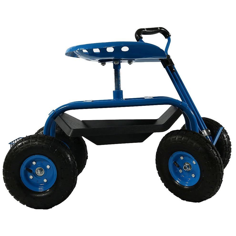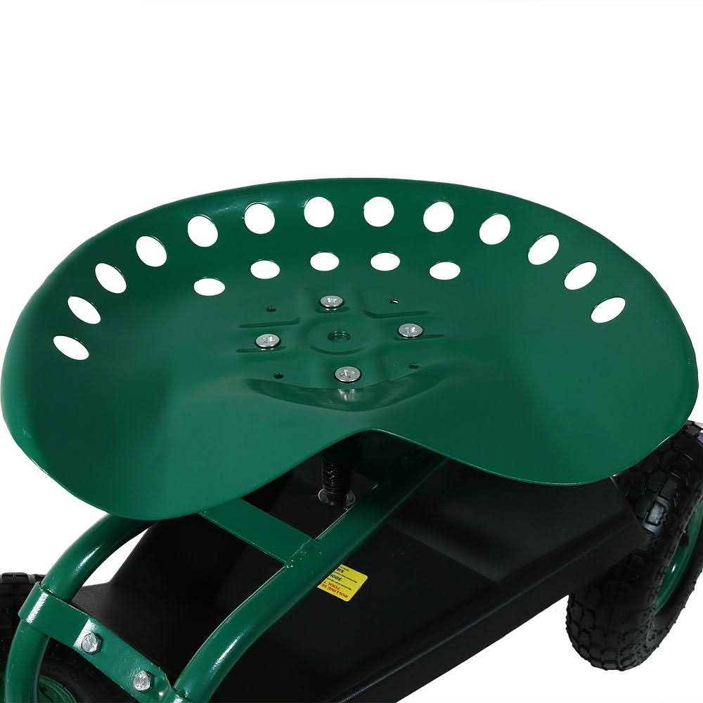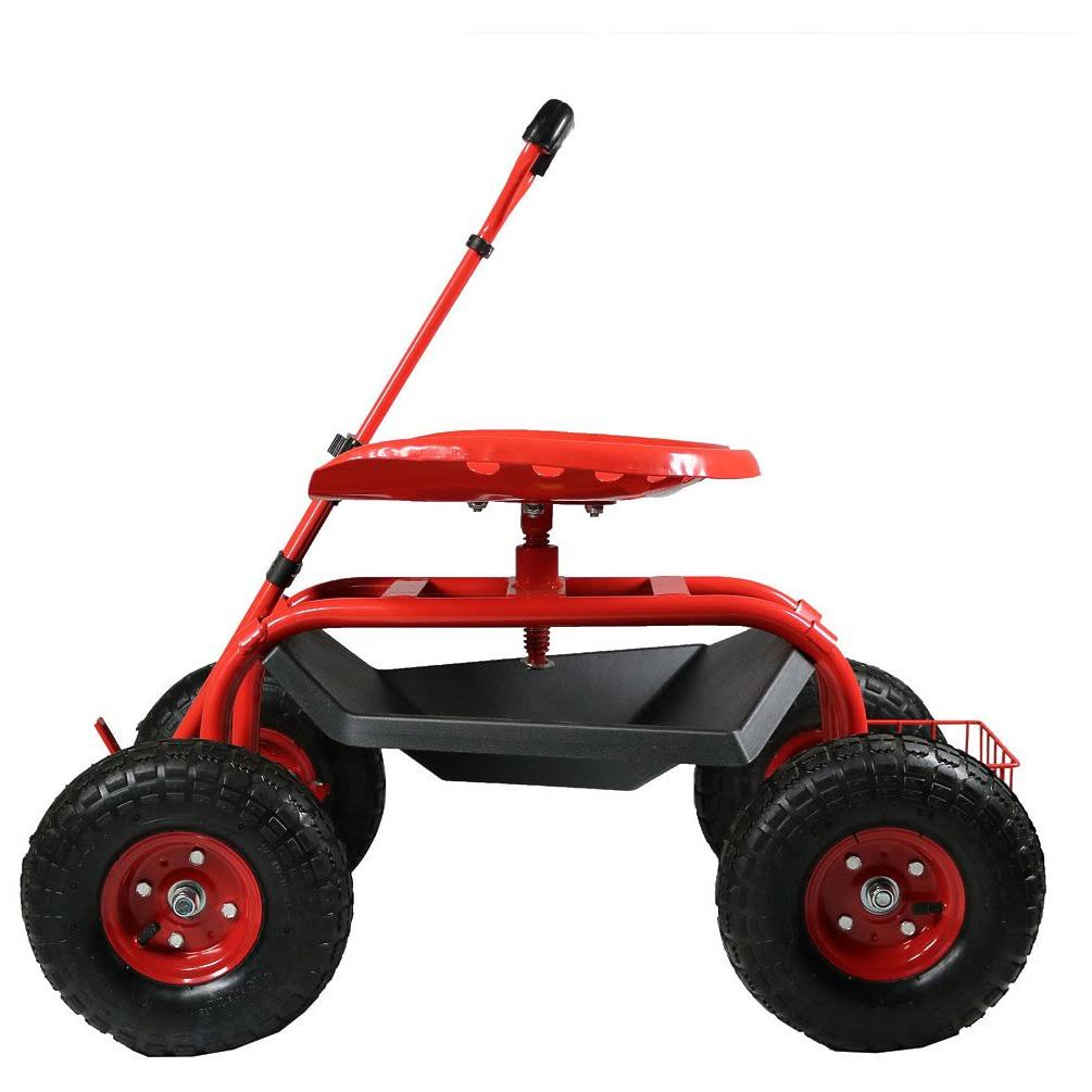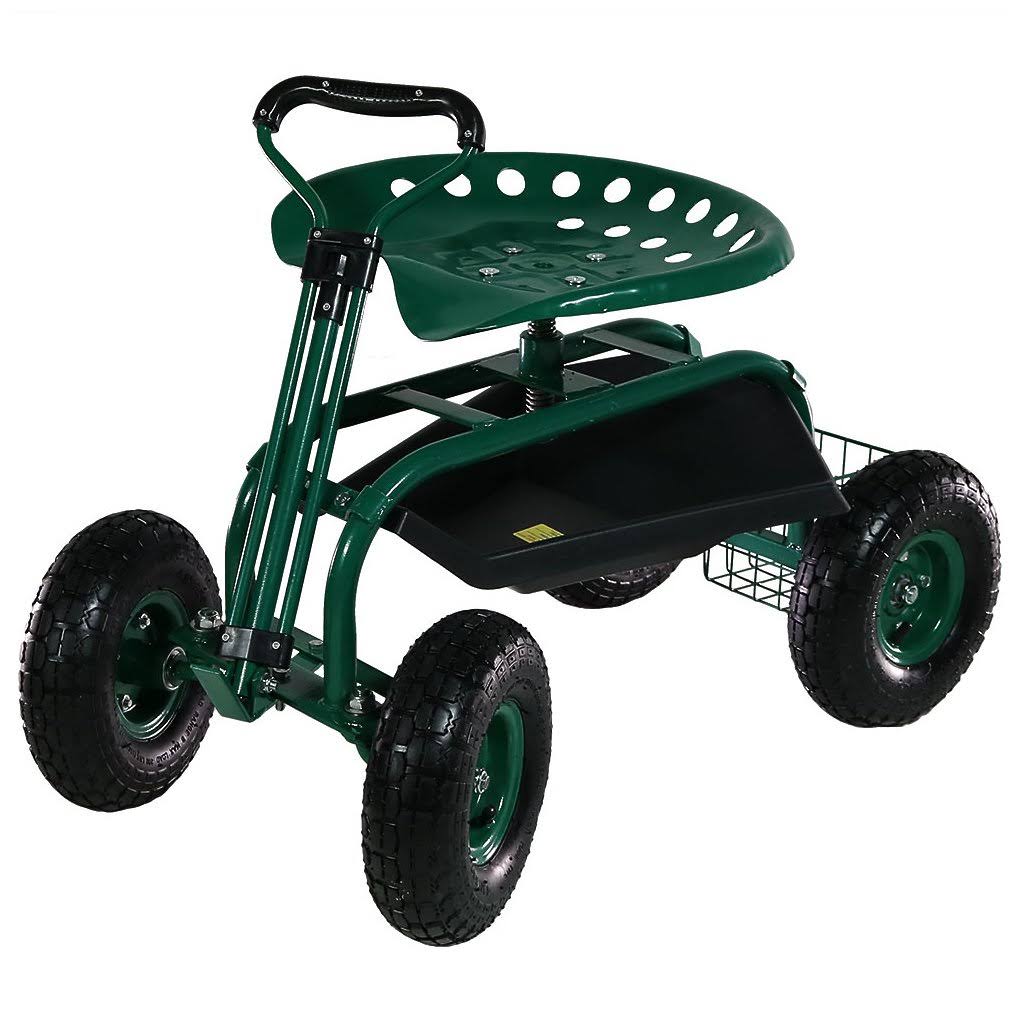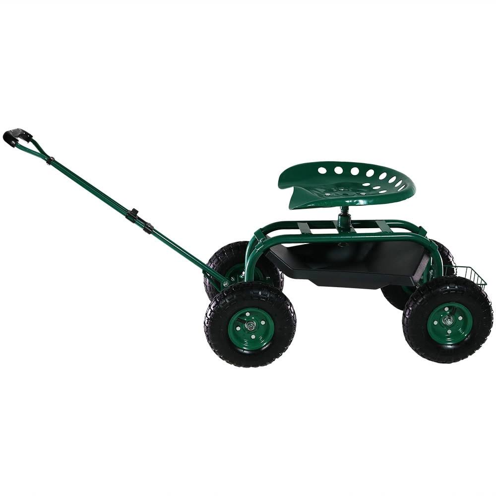Sunnydaze Green Rolling Garden Cart with Extendable Steering Handle, Swivel Seat u0026 Basket