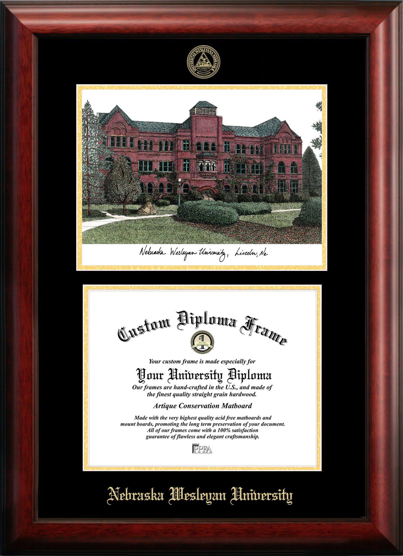 Nebraska Wesleyan University 11W x 8.5h Gold Embossed Diploma Frame with Campus Images Lithograph