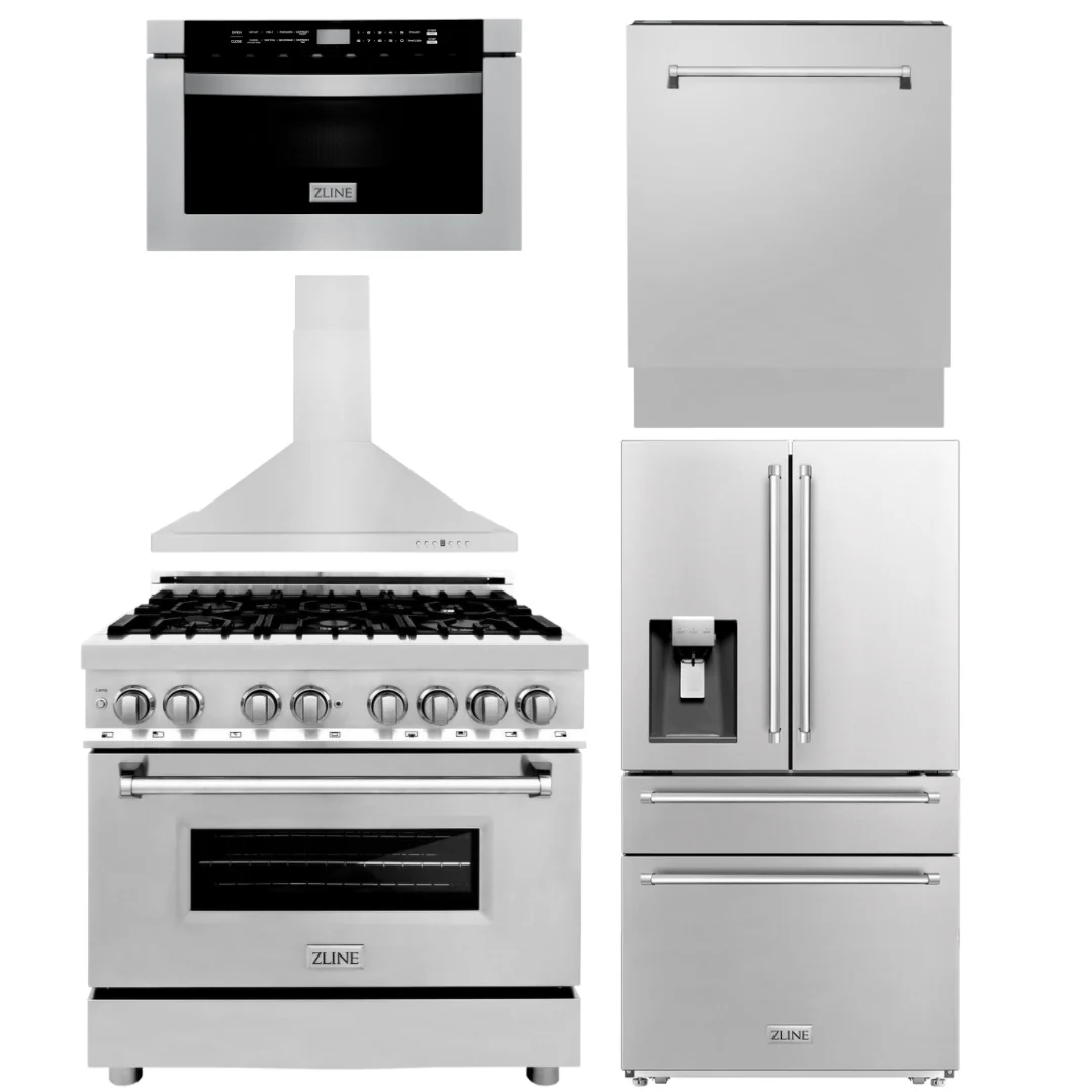 ZLINE Appliance Package - 36 Dual Fuel Range, Range Hood, Microwave, Dishwasher, Refrigerator with Water and Ice Dispenser