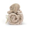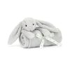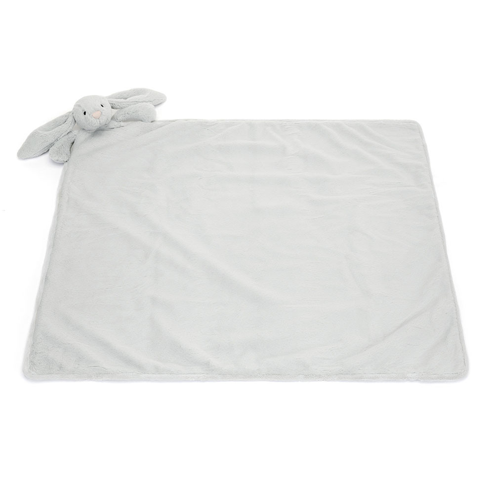 The Bashful Silver Bunny Blankie combines our most loved Bashful Bunny character??s long lop ears, pink suedette nose, embroidery eyes and soft squashy paws with a blankie made from the same cloud soft, silver-grey coloured fur in recycled fibres. Neatly rolled and tied with a Baby Jellycat grosgrain ribbon, this is an exquisite gift of endless comfort and timeless charm.