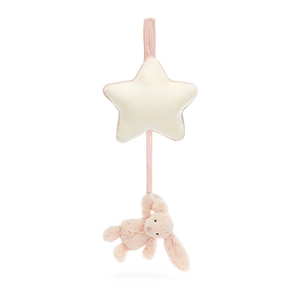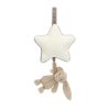An enchanting newborn gift, let babies dream sweetly with a Bashful Silver Bunny Musical Pull. Our most loved Bashful Bunny, in soft, silver-greyfur made fromrecycled fibers can be gently pulled to hear an original Jellycat lullaby. The cream star shaped musical pull with contrast trim can be attached to a crib or pram with a Velcro fastening.