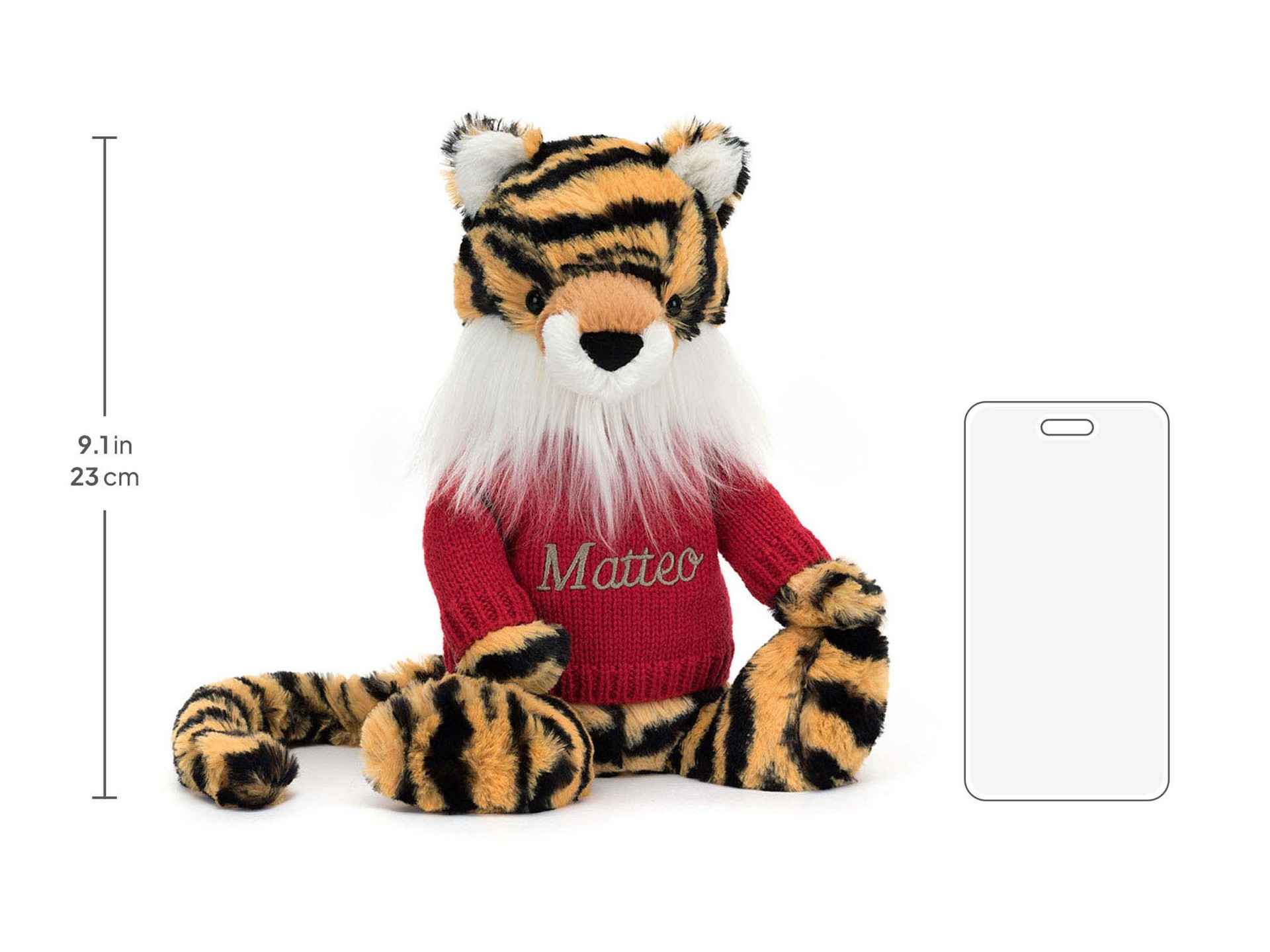 Bashful Tiger is a super soft beloved Jellycat and can now be made extra special with a personalized red jumper! With a choice of fonts and thread colors, your tiger can truly be one of a kind!