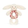 A treat for tiny hands, Blossom Cream Bunny ??Berry?? Ring Rattle can be grabbed by its soft paws, long lop ears or ring-shaped tummy. When given a gentle shake it will sound the rattle inside, much to baby??s delight! Crafted in a cream colored fur made from recycled fibers with a strawberry patterned tummy in an original Jellycat design, featuring a Bashful Bunny pink suedette nose and embroidery eyes.